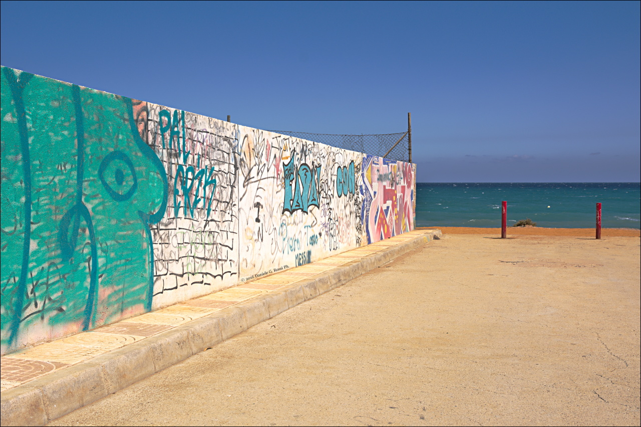Sembra che tutto voglia "sbarrare" il mare, la rete, il muro dipinto, i paletti rossi, eppure c'è tanta voglia di libertà.