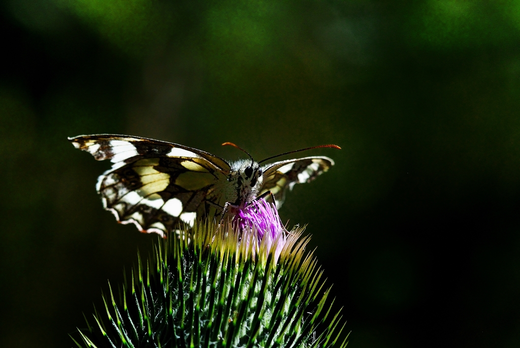 La sottoesposizione è voluta; ma dell'immagine mi piaceva il contrasto fra le spine del cardo e la leggerezza della farfalla. Come tute le mie riprese è stata fatta a mano libera, "al volo" con priorità del diaframma -7,1- e -1 EV di sottoesposizione.