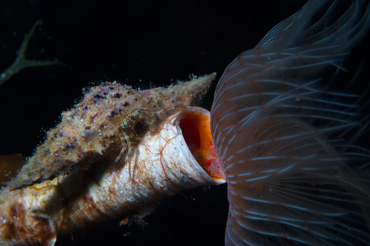 Un piccolo paguro dentro una conchiglia di cerithium si arrampica su una protula.