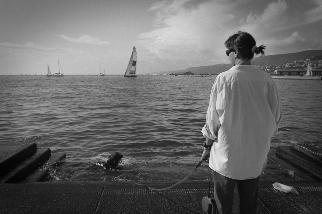 Non riesco a trovare il nesso tra il cane che fa il bagnetto in basso, la padrona in primo piano e le barche sullo sfondo.