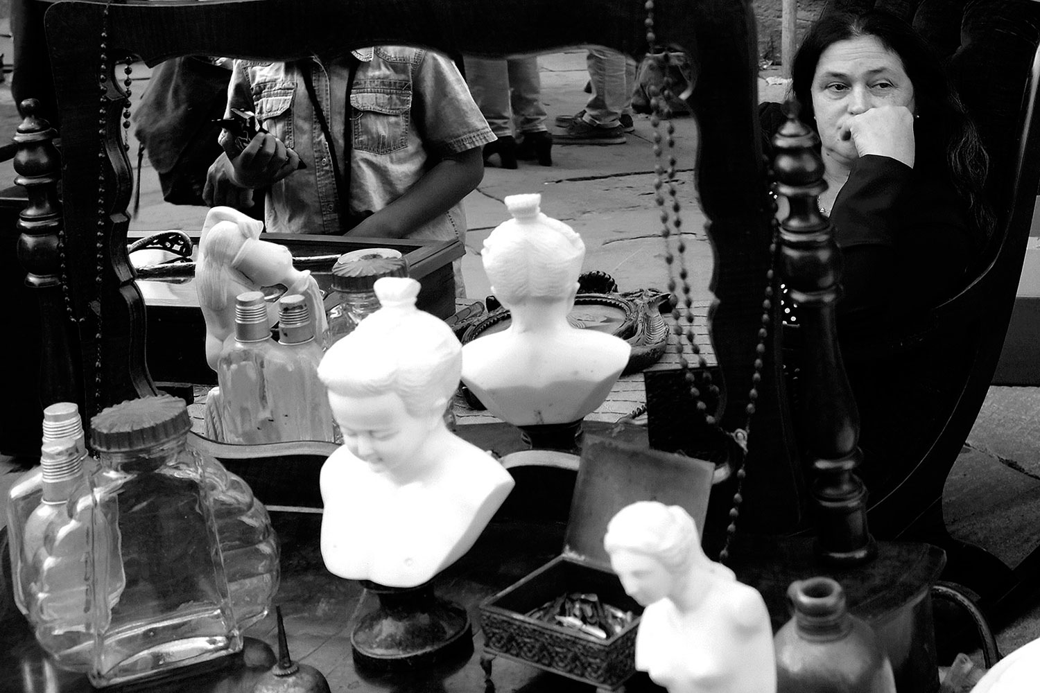Le teste riflesse e non (e una mozzata) sono il fulcro della foto e lo e' anche lo sguardo un po' annoiato della signora.