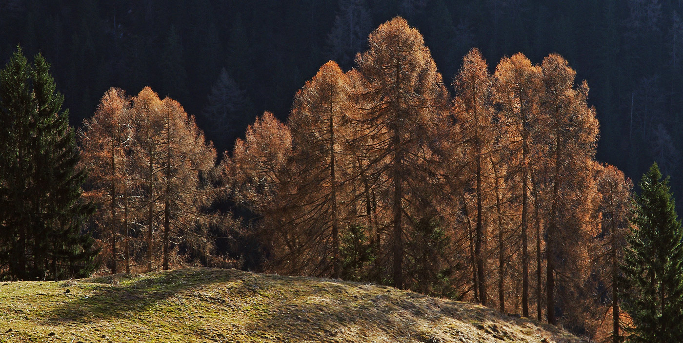 Chiaroscuri sul pendio e una fitta e dotata barriera alberata. Gran luce per una foto riuscitissima.