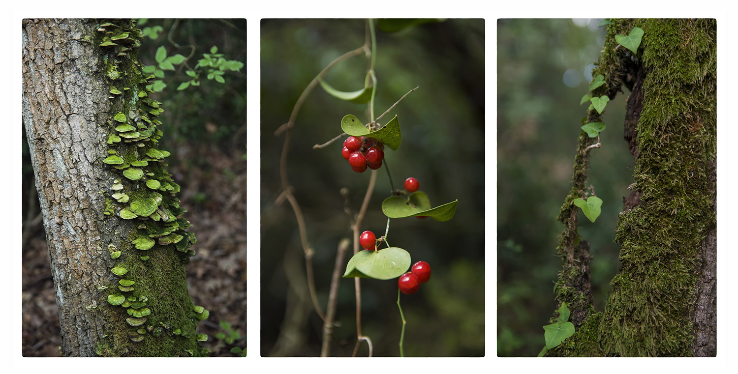 Una bella proposta, con i tronchi delle due foto ai lati quasi simmetrici a racchiudere i rossi frutti centrali.