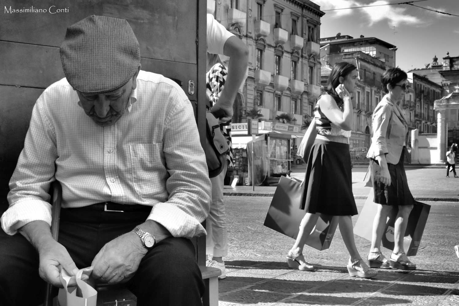 "purtroppo" essendo una street...non ho avuto modo di "mirare" bene lo scatto. Aggiungo un altro dettaglio, oltre al ginocchio, che meritava un pizzico di visibilità maggiore. La busta in mano all'anziano. Se si fosse vista un pizzico meglio avrebbe evidenziato ulteriormente la solitudine rispetto le due ragazze sullo sfondo |