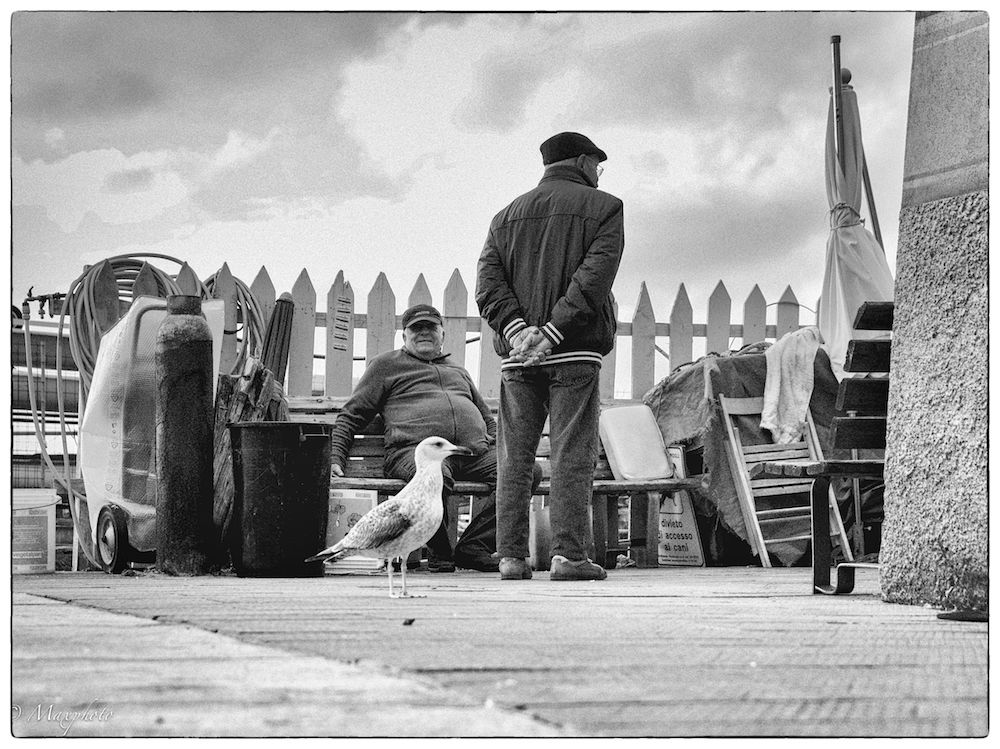 Peccato solo, come ti hanno già detto, per alcune sovrapposizioni, perchè la scena è simpatica, il bianco e nero molto piacevole e la posa del signore in piedi quasi comica ( a me ricorda simpaticamente lo straredavanti ai lavori in corso di certi pensionati...). Forse l'impatto street è un poco debole, ma no esistente. Ci pensa il gabbiano, ignorato dall'uomo in piedi, troppo concentrato su altro, a restituire quel pizzico di insolito e straniante.