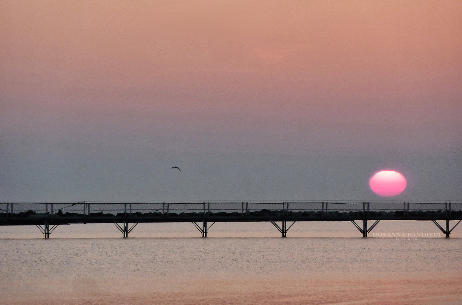 Mi piace questa tonalità di colori. Bella anche la composizione e l'atmosfera che si vede. Ma... non so, forse è il mio monitor, ma vedo un alone attorno al sole e il bordo superiore del sole rimarcato di rosso.
