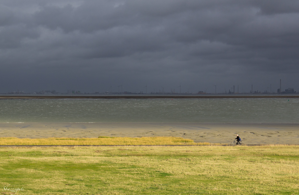Cielo opprimente carico di temporale ...ma perfetto per il contrasto con il verde dell'erba e dell'acqua ... Poi il piccolo uomo in tanta immensità..ulteriormente piccolo perché cammina, anziché pedalare, ancora più fragile in quell'enorme quadro apocalittico! Molto bravo!