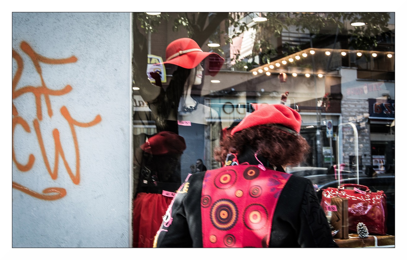 Si forma un triangolo strano ma efficace tra il cappello della signora, il suo riflesso e quello del manichino, tutti rigorosamente rossi. Ben giocata quindi e ben composta, buone pure le cromie, forse solo un leggero rumore come appunto...