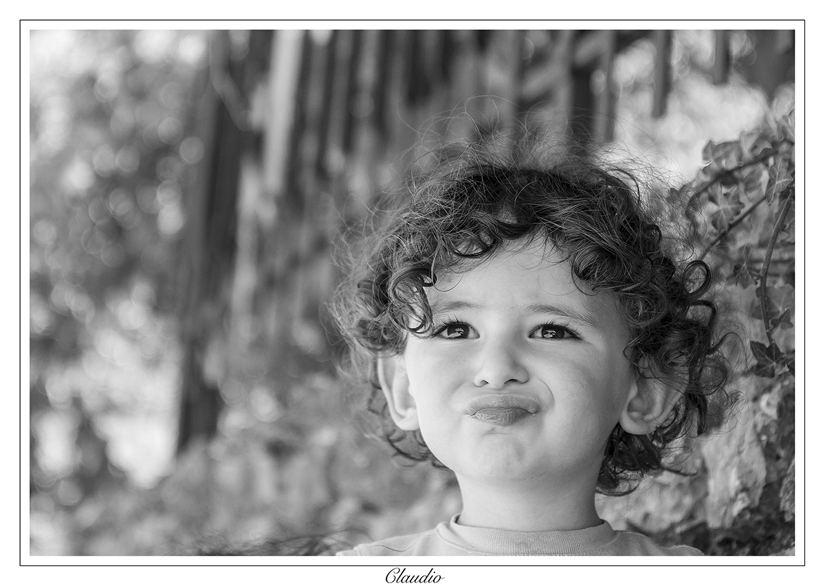 Decisamente contrariato! E si resta in dubbio se a generare il simpatico broncio, sia qualcosa che Claudio vede fuori campo... o un aggancio sottile dei tentacoli dell'edera alle sua spalle, che vogliono impadronirsi della chioma ricciuta. Che è davvero irresistibile. Un ritratto tenero e solare, che scherza un poco compositivamente con questa diverso tipo di intrecci contemporaneamente in scena. molto bene il bianco e nero.