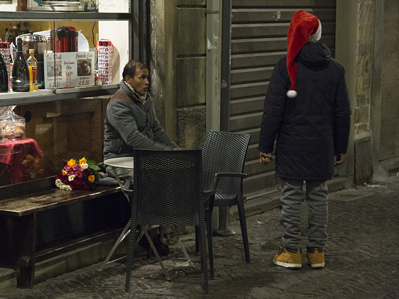 certo che lo sguardo dell'uomo seduto è impagabile. non capita tutti i giorni di trovarsi uno 'pseudo-babbonatale' che ti sta davanti indeciso sul da farsi