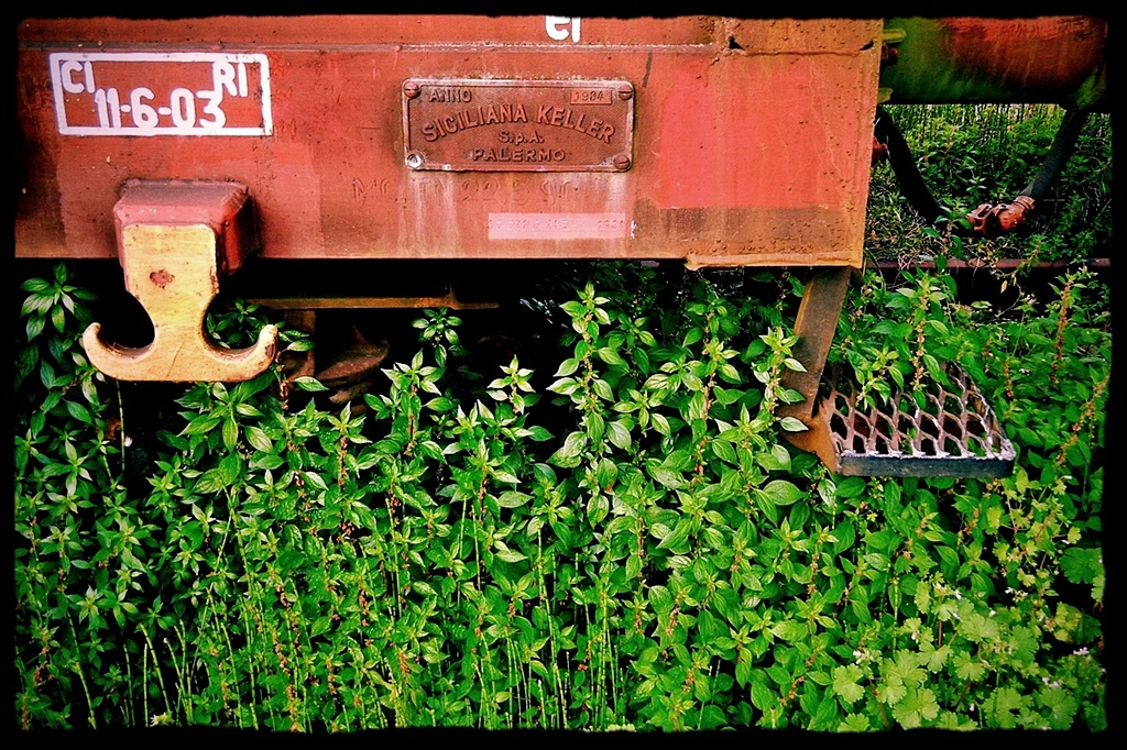 Piacevole fusione tra reperto metallico e natura spontanea. Efficace emblema del concetto di abbandono e dello scorrere del tempo. Belle cromie.