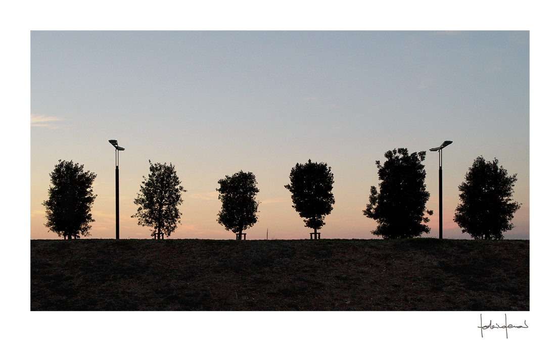 Minoranza di pali di illuminazione, e maggioranza di presenze alberate, ben presentate in silhouettes. Ottima resa contro questo delicato tramonto rosa azzurro.