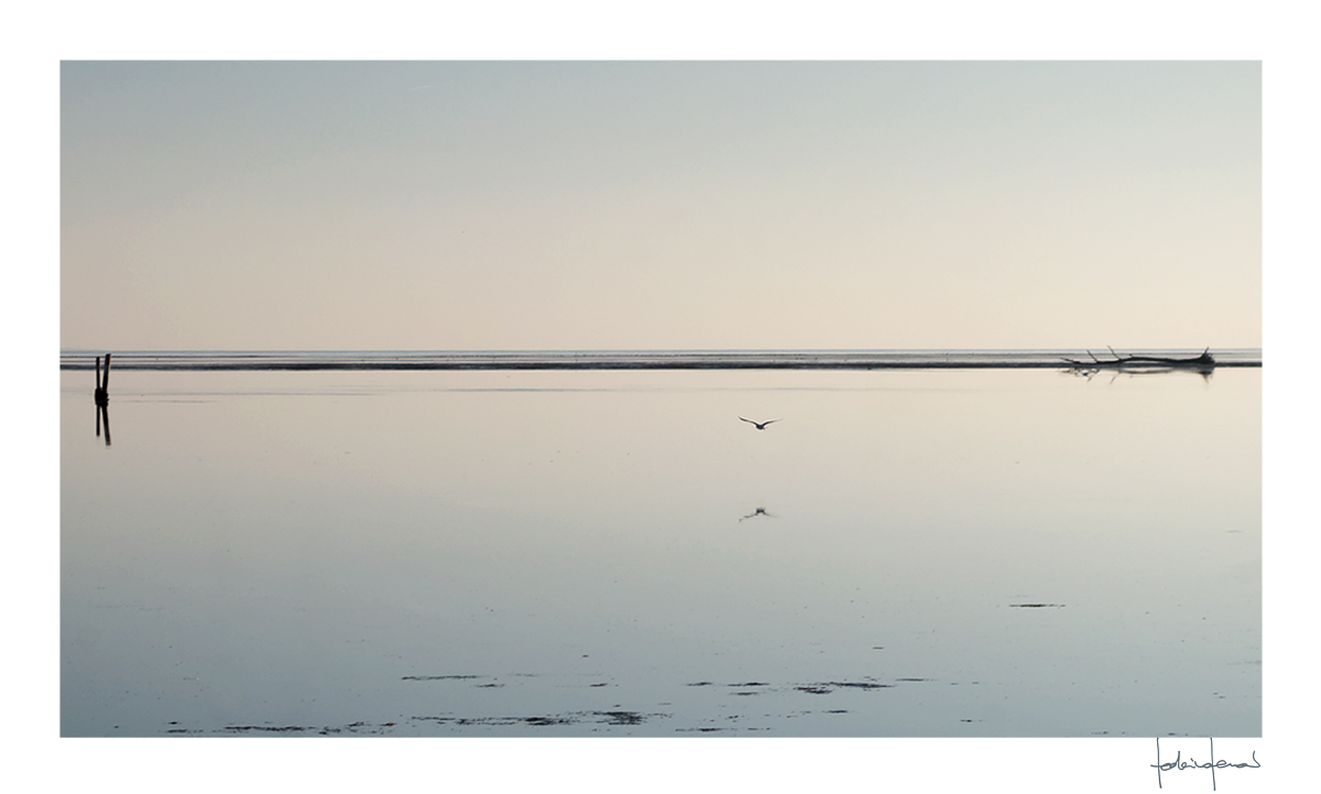 Un minimal dai tenui colori. Il volo del gabbiano ed il suo riflesso sono il fulcro della foto e forse avrei escluso dall'inquadratura i pali a sx e il tronco a dx. In effetti formano una triangolazione ma sono molto ,forse troppo, vicini ai margini e piu' che apportare qualcosa tolgono attenzione dal bel volo ripreso.
