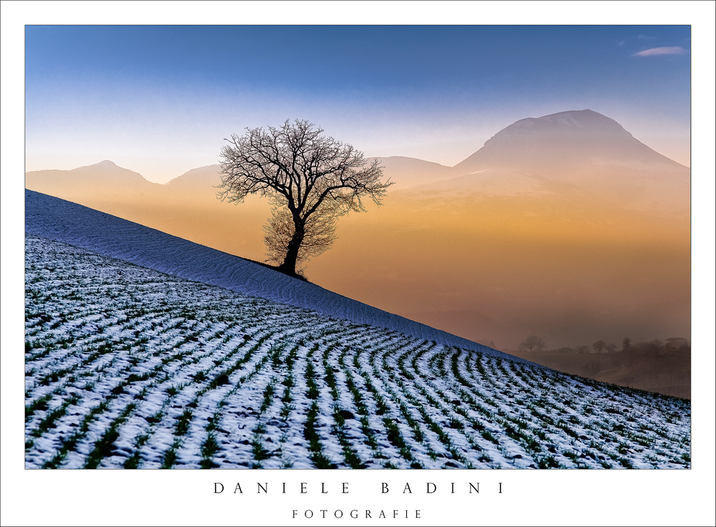 Foschia riscaldata dalle tinte aranciate, ombre rinfrescate d'azzurro, e una distesa di neve in ordinate strie di terra. Si scivola sul pendio con vero piacere visivo, si saluta il grande alberello dai mille rami sottili , e ci si abbandona ad una favola paesaggistica scaturita dal vero....