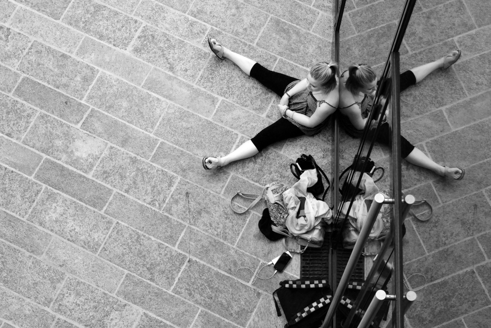 Il taglio quadrato potrebbe starci, ma nelle intenzioni iniziali volevo evidenziare l'effetto del riflesso delle gambe, più che la simmetria generale (comunque imperfetta), mantenendo allo stesso tempo una lettura da sinistra a destra...