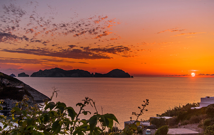 molto bella questa visuale al tramonto di Palmarola presumo, da Le Forna a Ponza....il primo piano da si profondità all'immagine ma, lo trovo anche un po invadente e incasinato, in particolare non mi piacciono le macchine li in basso e le fronde a coprire parte della scogliera a sx...pende a dx.