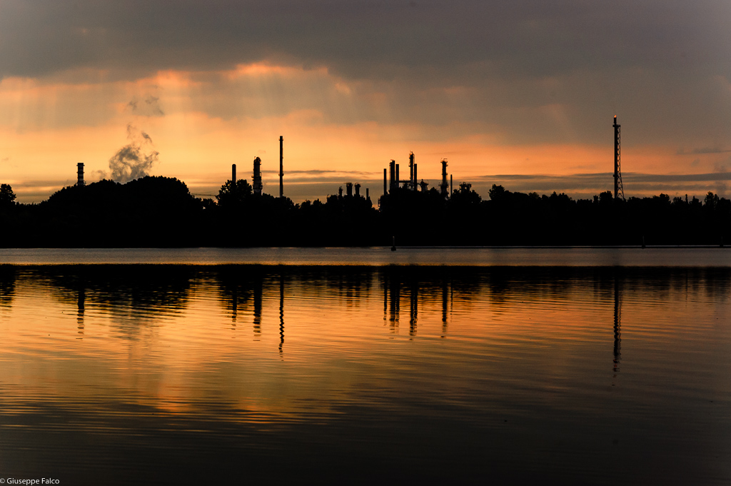 Un silhouette lunga e scura , importante come massa; ma la tua composizione, che la immerge nel colore arancio a centro fotogramma , e la avvolge di luce in alto fra le nuvole ed in basso con la ampia lucidità del riflesso, mette le cose in equilibrio. Anche il punto di luce rosso all'apice della torre e il controlaterale sbuffo di vapore fanno la loro parte.