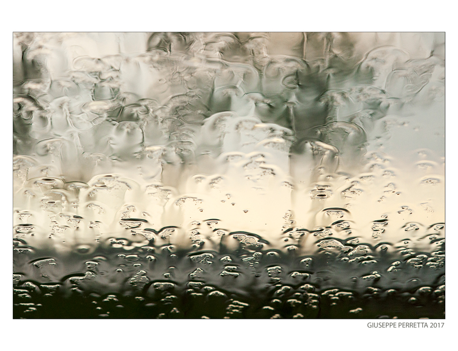Piccole forme che nascono e muoiono in un istante, occhi accennati che si scompongono prima di aprirsi, nella curve dell'acqua che scivola. Un gioco in svolgimento sul parabrezza. Tanta fluidità e lucentezza quasi metallica.