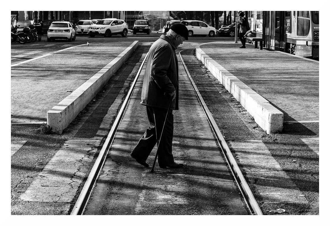 Tralasciando lo sfondo, che non fa impazzire neanche me, devo dire che ho avuto pochissimi secondi per comporre e scattare. Ho scelto istintivamente una soluzione orizzontale perché volevo evidenziare l'attraversamento pedonale. Mi piaceva la compresenza di tanti elementi "metaforici", da voi prontamente colti. Su tutti, il concetto di attraversamento, di cammino, e la prospettiva del binario.  |