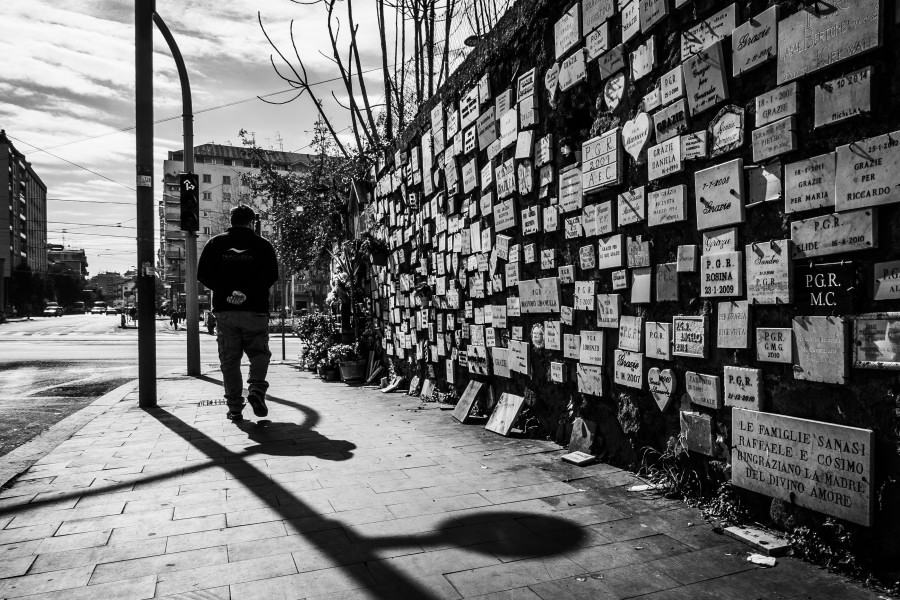 | un muro pregno di fede e speranza, sembra quasi impossibile in un ambiente urbano al giorno d'oggi trovare tanto raccoglimento interiore. buona l'idea di lasciare a sinistra tracce del contesto, la presenza umana inoltre è molto funzionale.