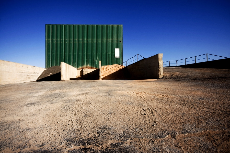 Mi piace moltissimo: la pura forma dell'edificio verde, il rettangolo chiaro che pare uno specchio che non riflette, le ombre a 45° del muro di cinta, la matericità scabra del terreno che pare voler saltar addosso a chi osserva.