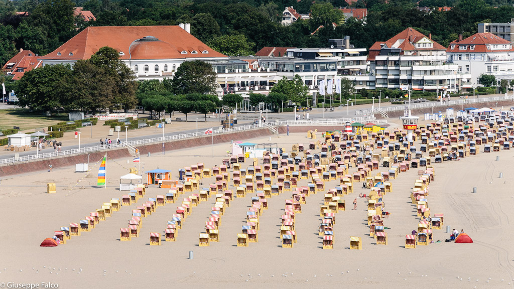 E' vero, si offre a varie scelte composititive, questo soggetto balneare-paesaggistico ( come la più drastica ma belle scelta panoramica) . Tanti piccoli elementi ripresi a distanza, e interessanti poi le mini tende a righe sull'arenile, e la lunga passerella di passeggiata, e i numerosi omini in transito. Ma a me non spiace affatto neppure la tua scelta compositiva iniziale, che comprende le costruzioni dai tetti rossi nel verde ,e una parte di parco a lato.