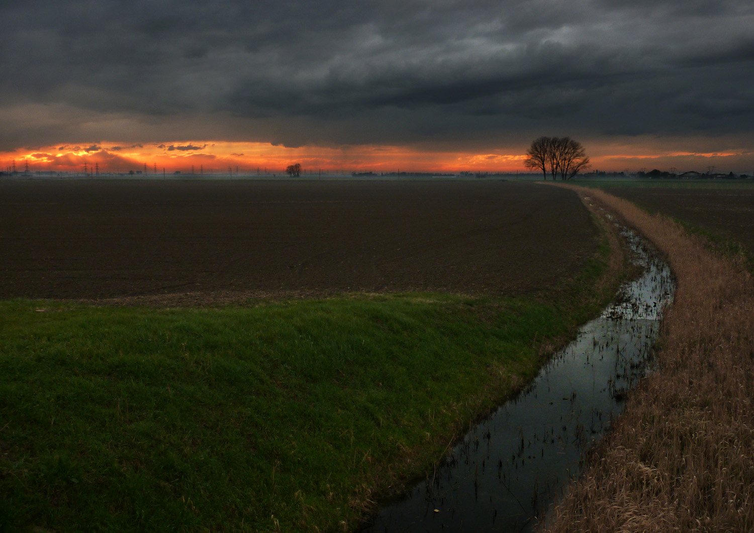 Provo a dirti la mia, in queste situazioni viene facile suggerire una schiarita ma forse soffermandosi un pochino ad osservare si capisce meglio l'intenzione. Io percepisco un accurato lavoro. Il rosso del cielo che schiarisce, il breve chiarore sul canale e il colpo di luce sul prato verde sono dei ''fari'' che illuminano, degli squarci di luce pittorica in mezzo a dei toni drammatici.