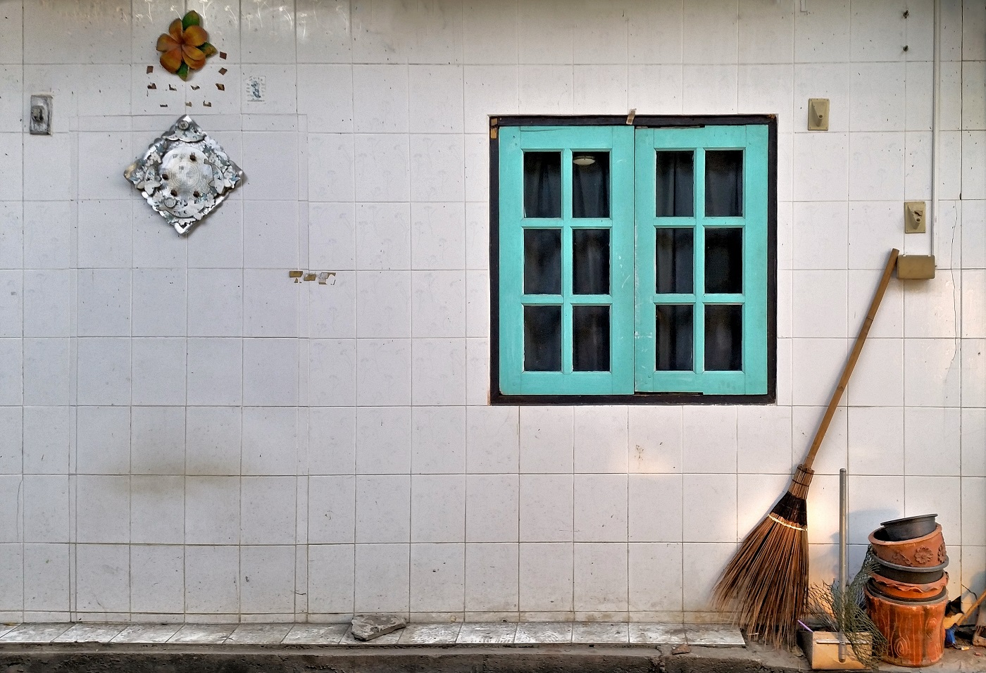 La finestra color turchese ricorda il mare e ravviva la scena.Per le piastrelle magari torna in mente il geometra di un film.