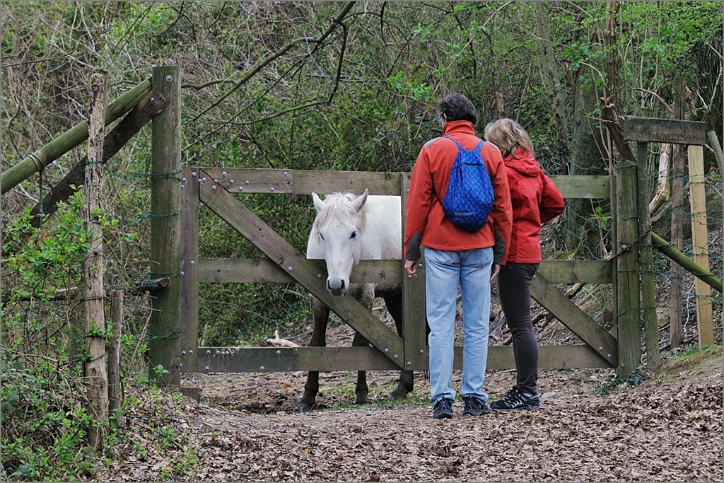 Una buona immagine bucolica arricchita dal bel contrasto cromatico tra vegetazione/cavallo e i rossi dei vestiti... Wink