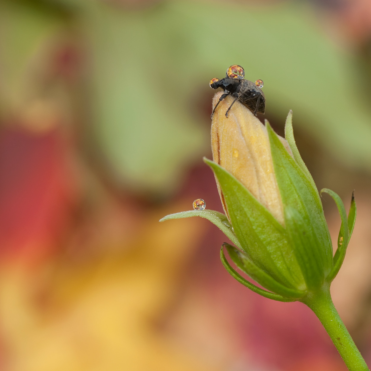 E' un gran peccato non avere la versione grande, mi sarebbe piaciuto frugare nelle gocce per scoprirne il contenuto, per il resto tutto bello, anche i colori e lo sfocato dello sfondo sono di mio gradimento. L'estrema precisione dell'uscita dello stelo dall'angolo, non sarà da tutti gradita, è un poco passata di moda.