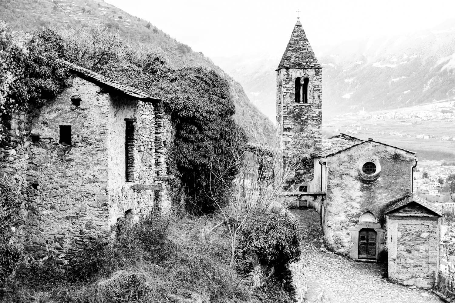 Qui il B/N scandisce i piani con efficacia. Lo sfondo abbraccia leggero e vaporoso la scena. Eccellente lo spigolo del rudere a sinistra che porta dritti al campanile.