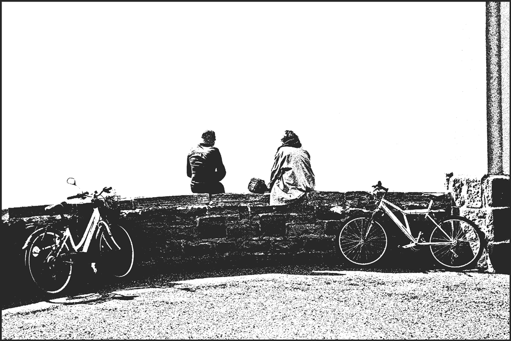 Molto belle queste chiacchiere luminose, discretamente riprese di spalle, e sospese su di un baratro di bianco, e come vegliate dalle bici pazientemente e in attesa.