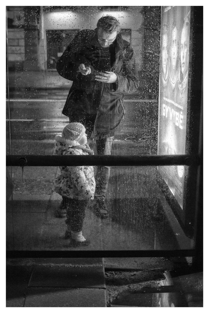 Mi piacciono le immagini attraverso i vetri bagnati. Simpatica scena , soprattutto per quello sguardo quasi "allucinato" della meravigliosa bimba restata flashata davanti all'insegna luminosa Smile Ciao