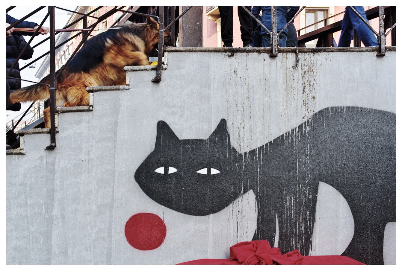 Il lavoro di Sergio dal punto di vista street è davvero impeccabile, dato che si ha esattamente la sensazione che il cane cerchi di far finta di ignorare le schiere nemiche... del disegno, affettandosi sulla scaletta.