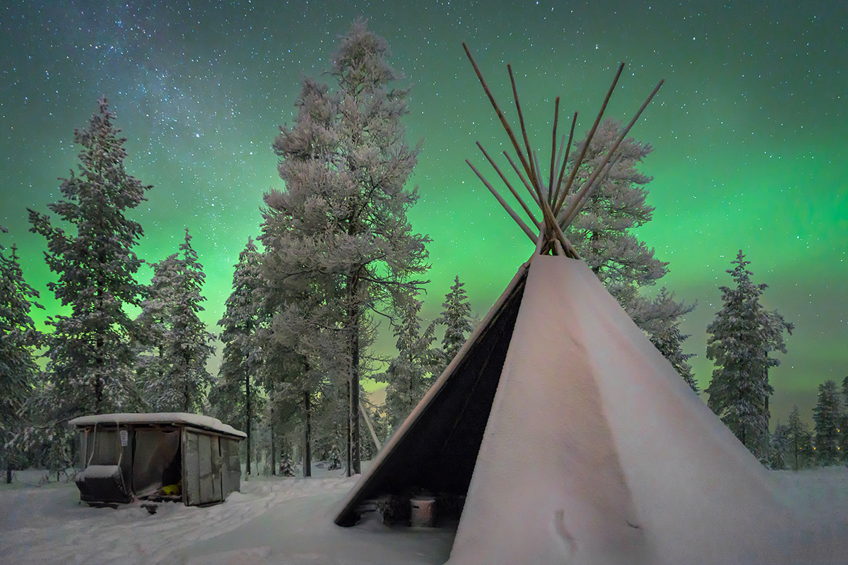 Tipica tenda lappone sotto un cielo colorato dall'aurora boreale.