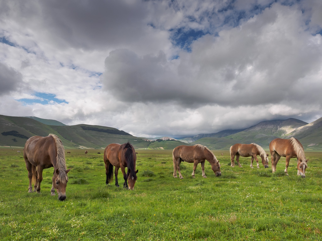 Una foto bucolica, rilassante paesaggio montano con i tranquilli cavalli ed il bel cielo ricco di corpose nuvole.