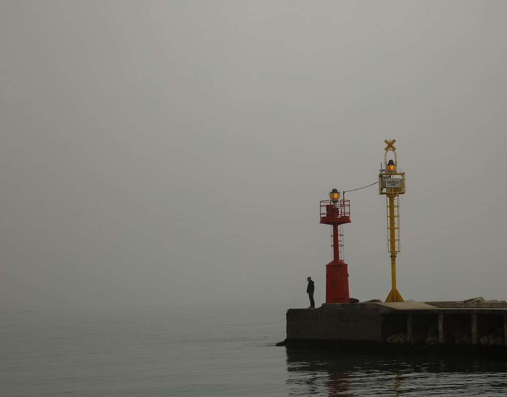 Bella composizione, grazie al cavo elettrico sembra ci sia un legame tra i due fari Smile mentre l'uomo sembra pensieroso.