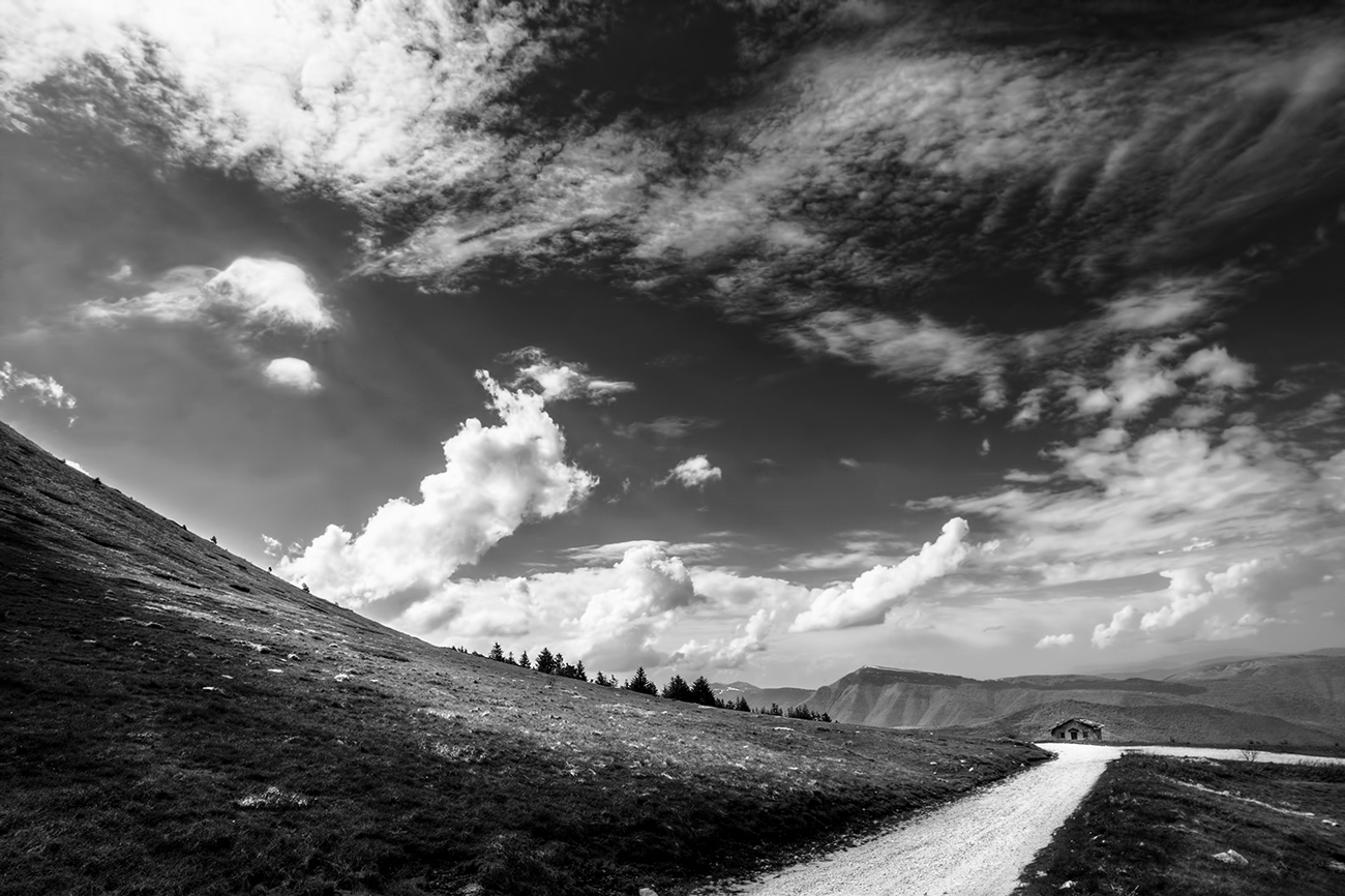 Un parsaggio splendido restituito in un'altrettando valido bn . La composizione si avvale della stradina sterrata che conduce alla piccola casetta e che poi prosegue biforcandosi.