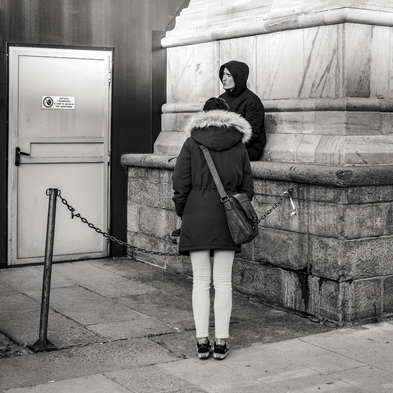 L'espressione del ragazzo con cappuccio sembra proprio rappresentare la delusione dell'escluso ed anche la ragazza ha una posa di attesa fissando quella porta che per loro forse non si aprirà.Bello anche il bn. Ciao
