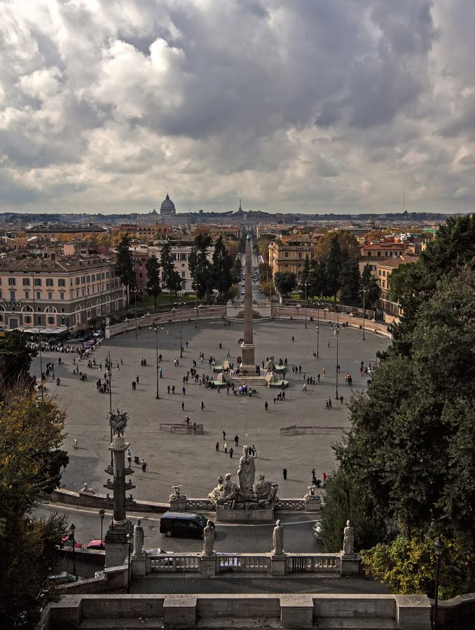 Formichine umane nel cerchio della piazza, e il cupolone in lontananza, che sfida un cielo grigio e fitto di nuvole minacciose. Eppuse, complice il punto di ripresa, tutto è libero ed arioso. La quantità di verde ai lati non è equamente bilanciata e simmetrica, ma questo non dipendeva affatto da te...
