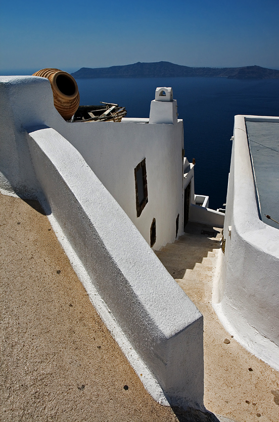Un otre gigante oltre il parapetto di una casa: , un efficace punto ocra, a sparigliare un poco le carte dell'ordinato alternarsi di bianchi lucenti ed incredibili azzurri, di mare e cielo. Una visione in cui ci si immerge a precipizio, seguendo in discesa la bella diagonale profonda del percorso compositivo .