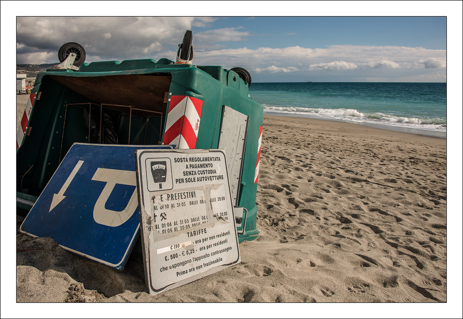 La casualità a volte crea paradossi che neanche la più fervida fantasia riuscirebbe a pensare.Formidabile questo accostamento che ci fa sorridere a denti stretti.Fortunatamente esiste anche il mare dove volgere lo sguardo,peccato ci ricordi tanto il colore del grosso bidone posteggiato senza pagare il tiket!Sempre grande occhio il tuo,Bruno. Un caro saluto,Sergio.