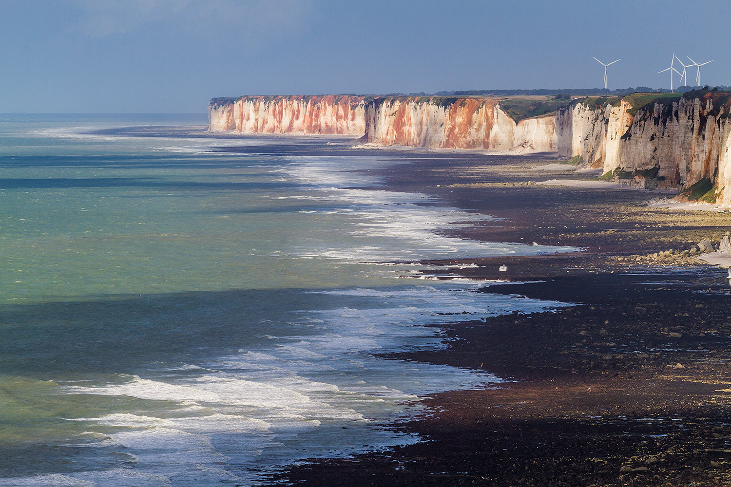 Ma il mio sguardo ora si sofferma qui, su questo scatto più tradizionale, ma che unisce il largo respiro di queste incredibili scogliere ( che ho visitato anch'io) , al racconto visivo dell'oceano, con la linea zigzagante della schiuma, che richiama nella forza del bianco il colore delle grandi pale eoliche lontane.