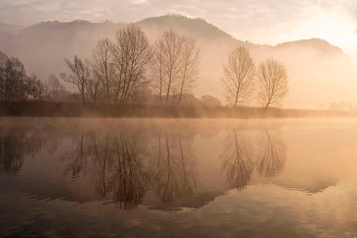 Bellissimi ed inconfondibili i tuoi scenari fluviali, Elis. Molto particolare l'effetto ripreso della foschia sull'acqua, che si solleva in bolle circolari, come un vapore soffice. Sopratutto il centro scena, con il suo incredibile riflesso alberato, circondato dal profilo dei monti, rasenta la perfezione.