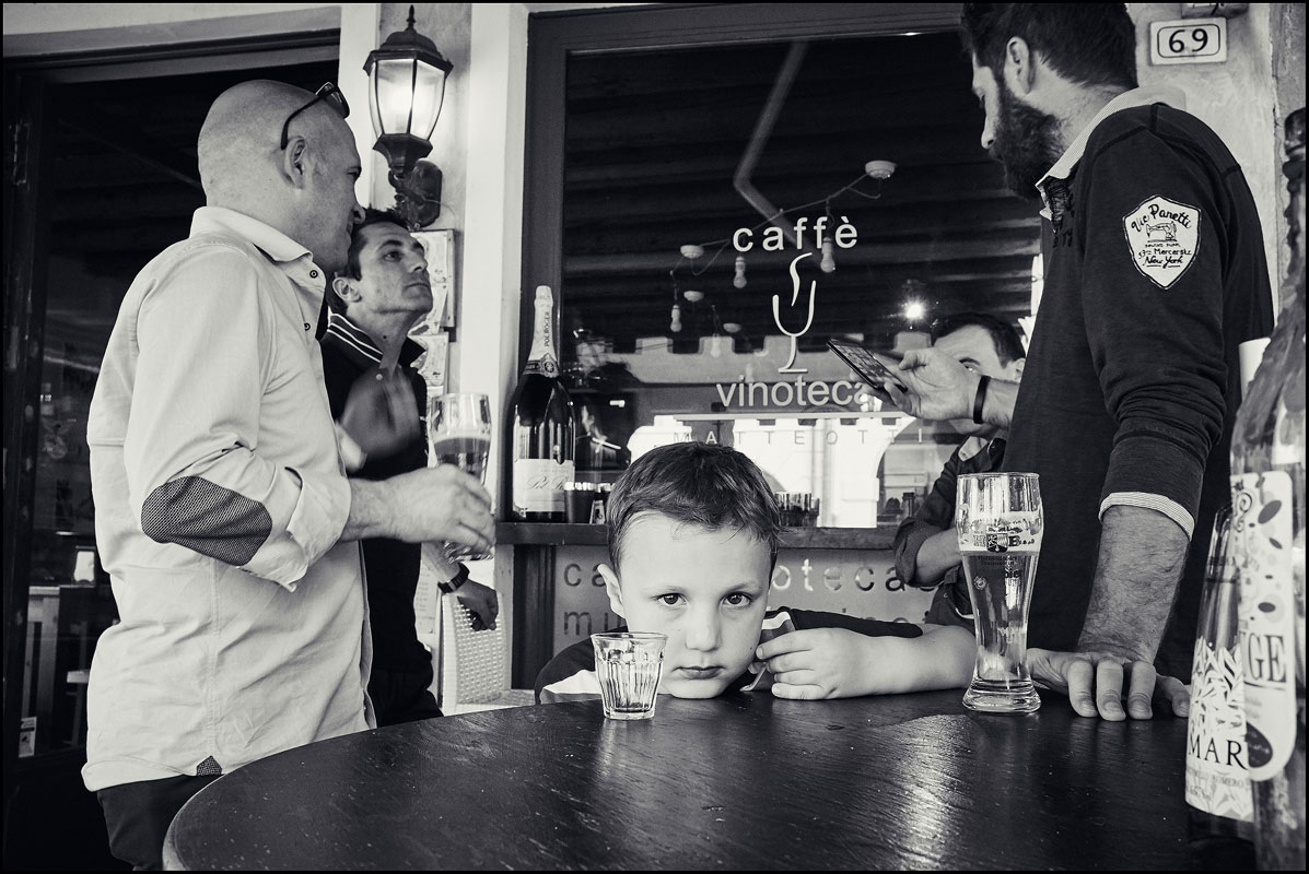 la prima cosa che ti colpisce aprendo questa immagine è lo sguardo del bambino, tra l'annoiato e l'imbronciato, poi si sposta sugli adulti che stanno parlando di cose serie (magari di calcio ) Ottima la nitidezza e il b/n.