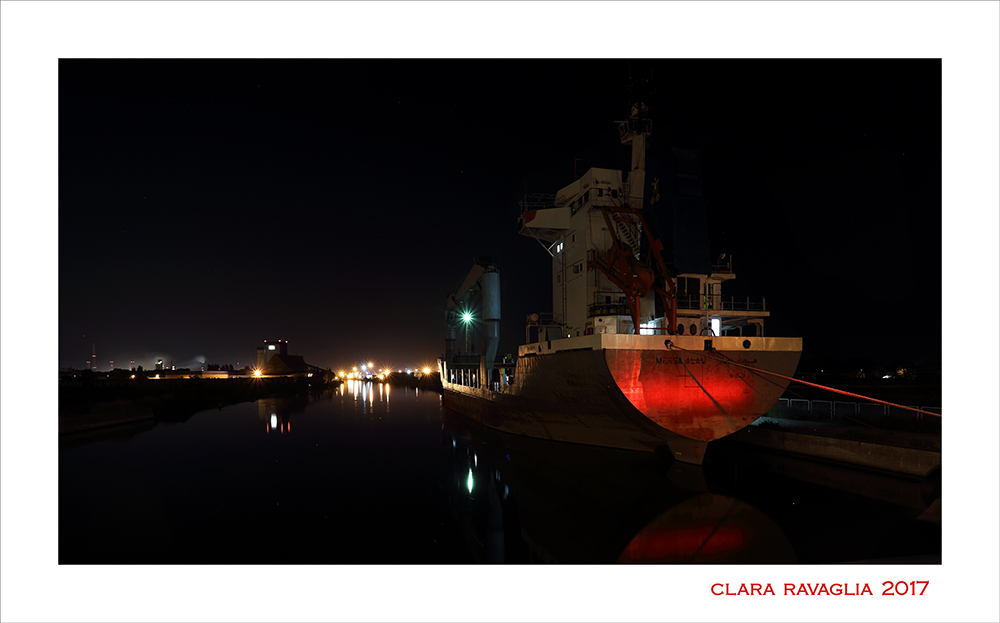 Sono impressionato dall'estrema pulizia nell'ambito della ripresa, la notte porta rumore e gestirlo non è semplice, buona composizione non ottima, credo avrei incluso totalmente la specchiatura della poppa della nave, qualche artefatto visibile nell'oscurità ma con una giusta rotazione dello schermo tende ad elidersi, il faro rosso (o un semaforo) "fanno" la foto altrimenti carente sul lato destro.