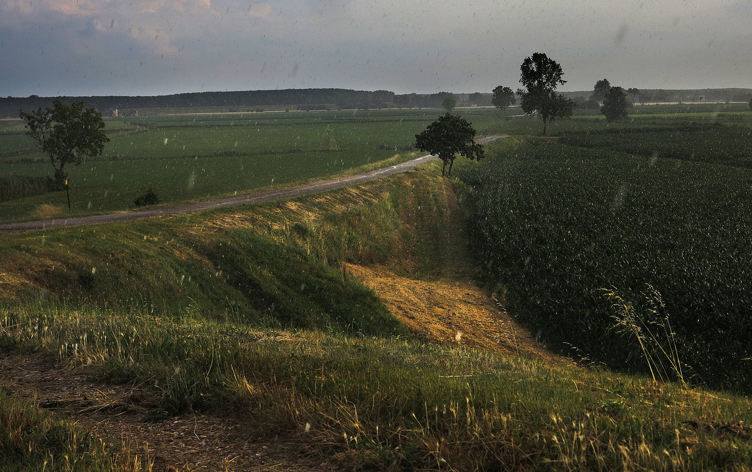A me piace questo contrasto cromatico tra la giornata piovosa ed il sole che riesce ad intrufolarsi tra le nubi.Bella composizione.