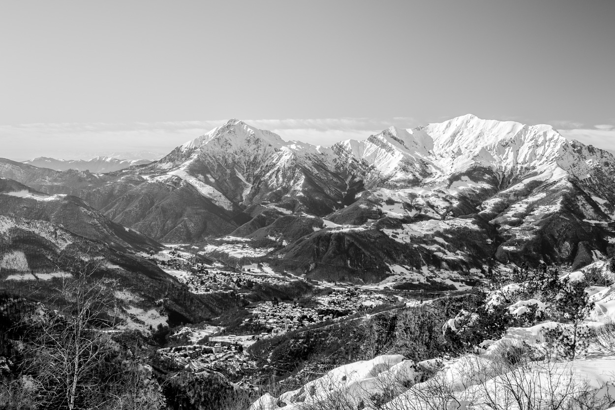 Maestoso scenario dove le alte ed innevate vette pur nel quasi acciecante biancore si stagliano nitide nel cielo.