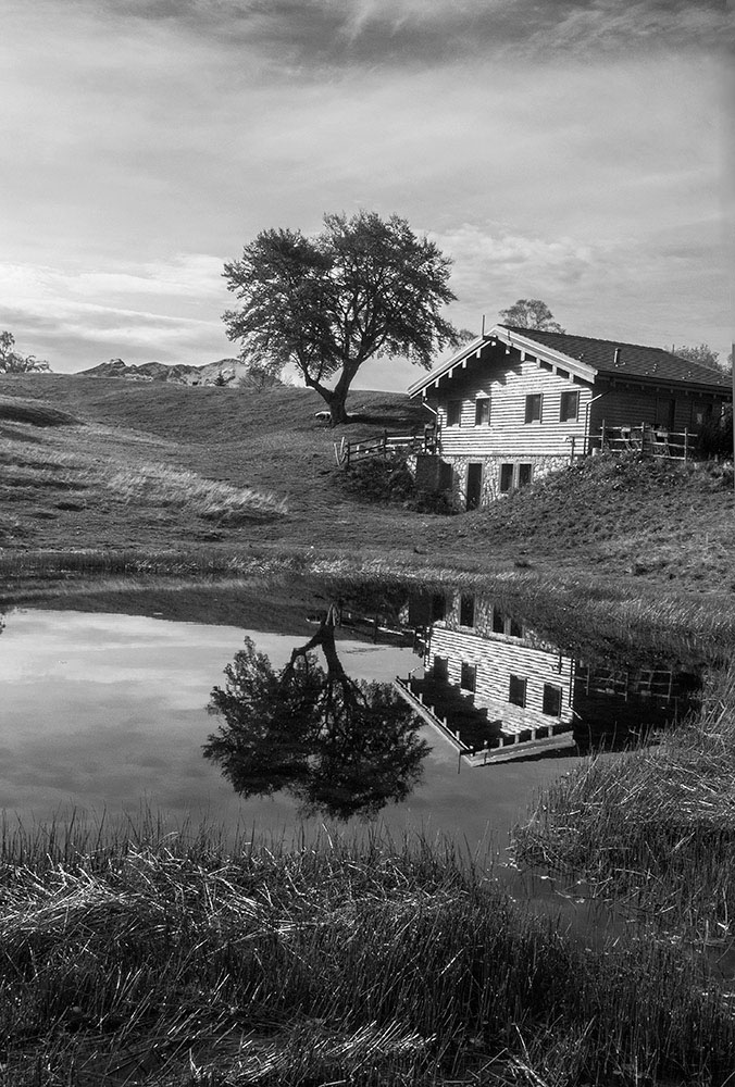 Vedo una condizione di luce che sembra ottimale, ombre lunghe alba o tramonto, immagino l'azzurro, il verde, il colore del legno dello chalet, insomma la conversione in questo bn mi parla di quello.