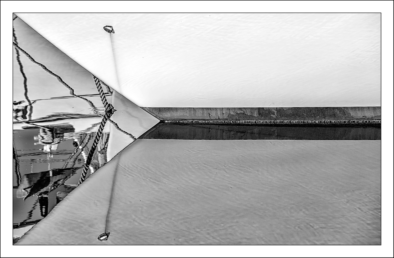 E' appunto lo scafo di uno yacht riflesso nella placida acqua del porto, oltre la conversione ho utilizzato un "estrattore" di dettagli, non HDR che non pratico mai, per evidenziare ad esempio la vegetazione sulla linea di galleggiamento e le striature dagli ombrinali.